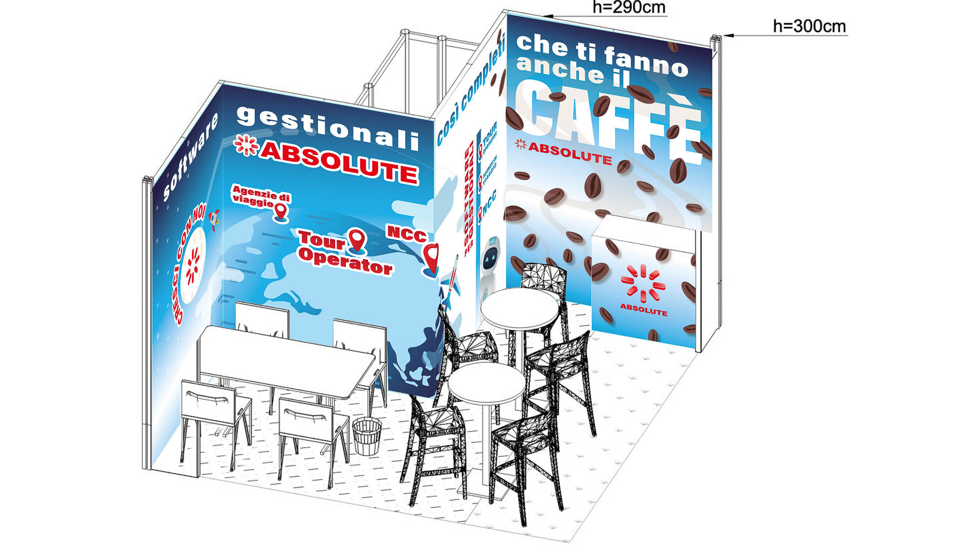 Abbiamo curato la progettazione grafica dello stand: un layout funzionale e d’impatto, capace di valorizzare i software e i servizi offerti.