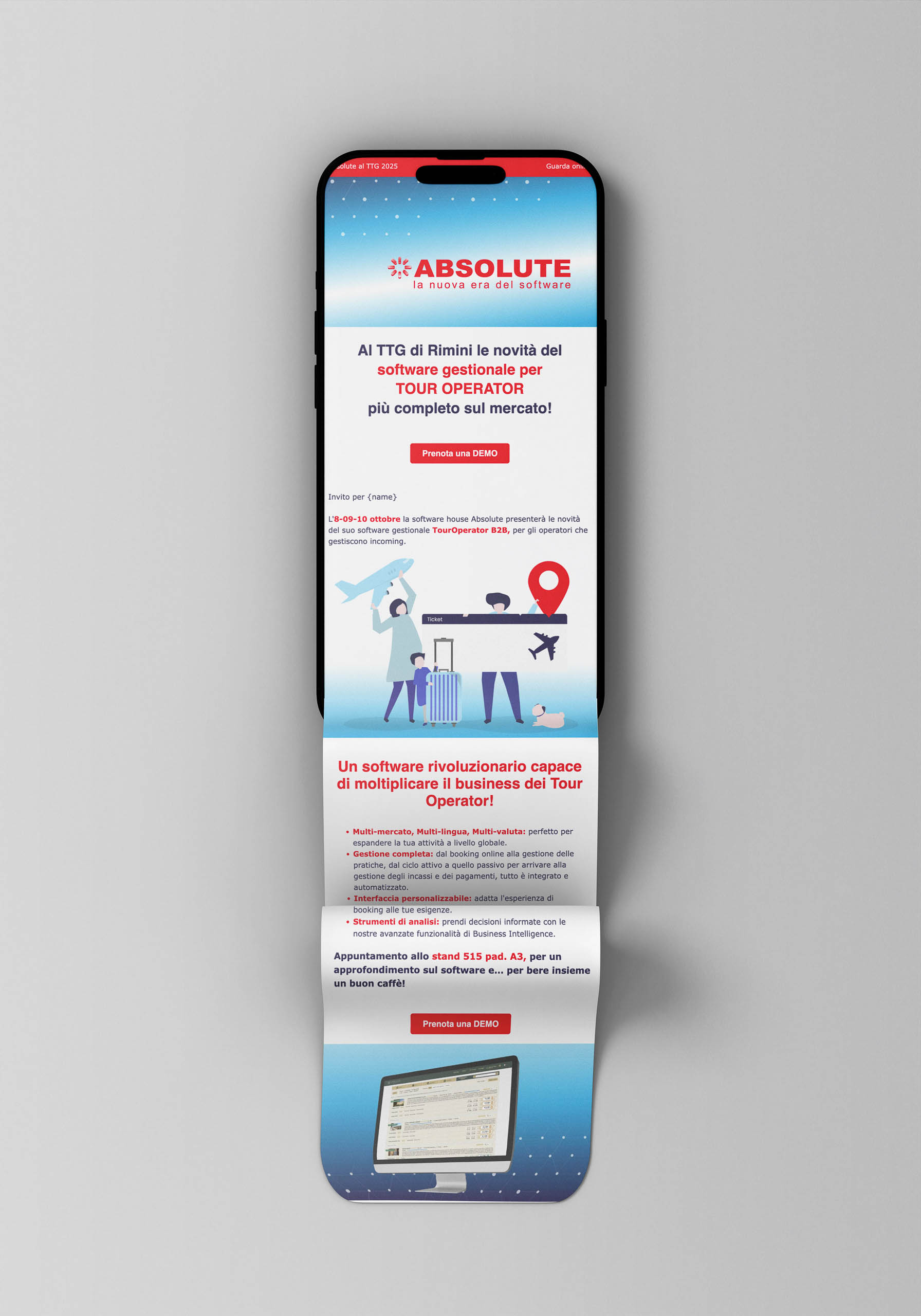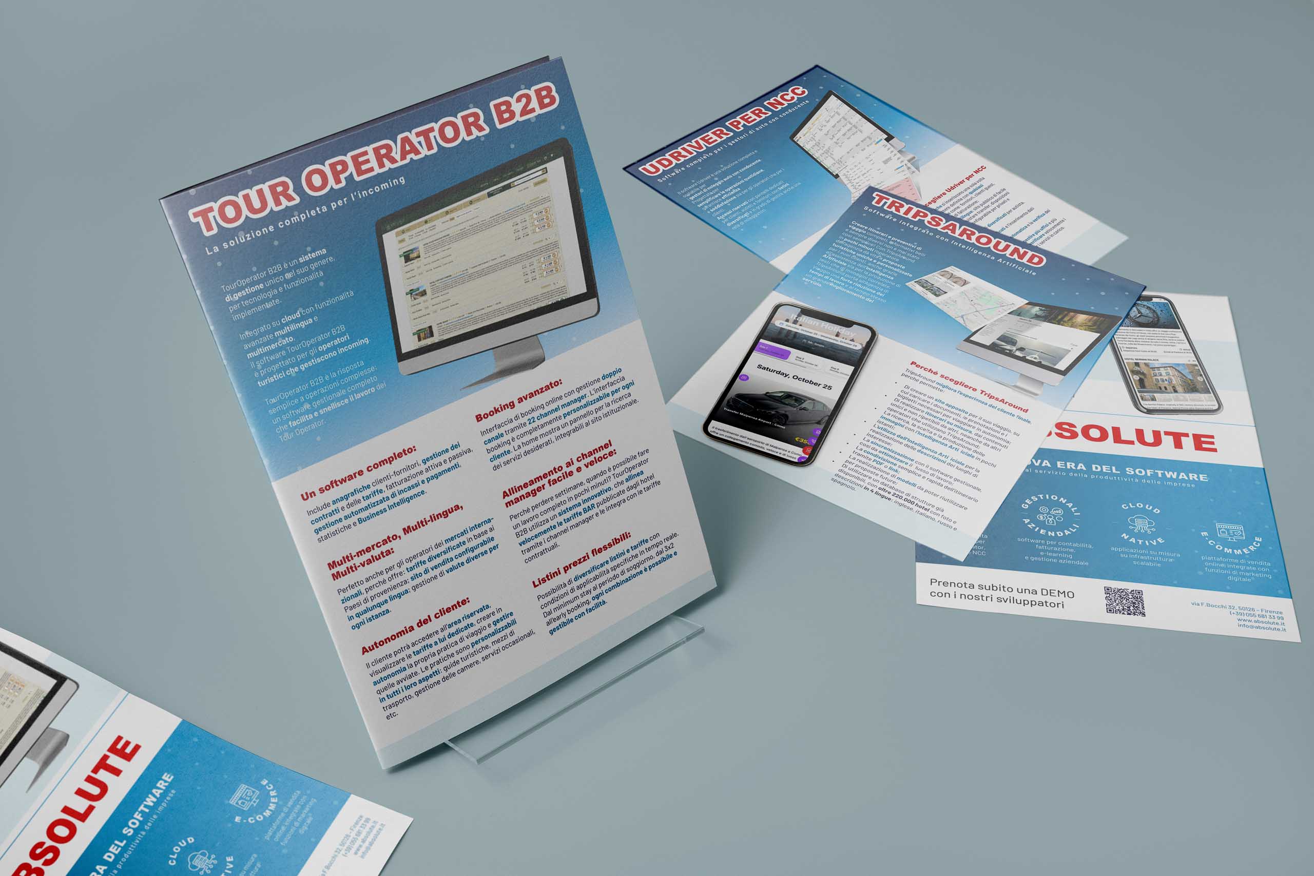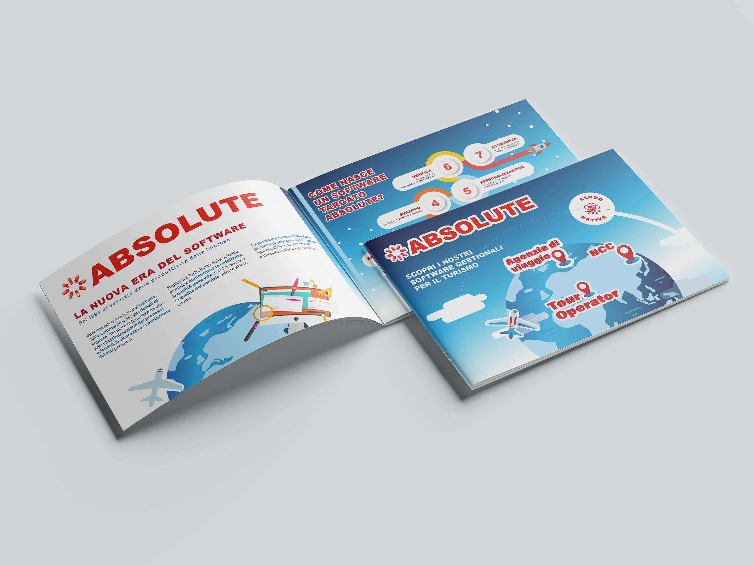 In occasione del TTG 2024 abbiamo realizzato una brochure istituzionale pensata per presentare in modo efficace le soluzioni software di Absolute. Ogni sezione della brochure mette in evidenza i vantaggi competitivi e la facilità d’uso dei prodotti.